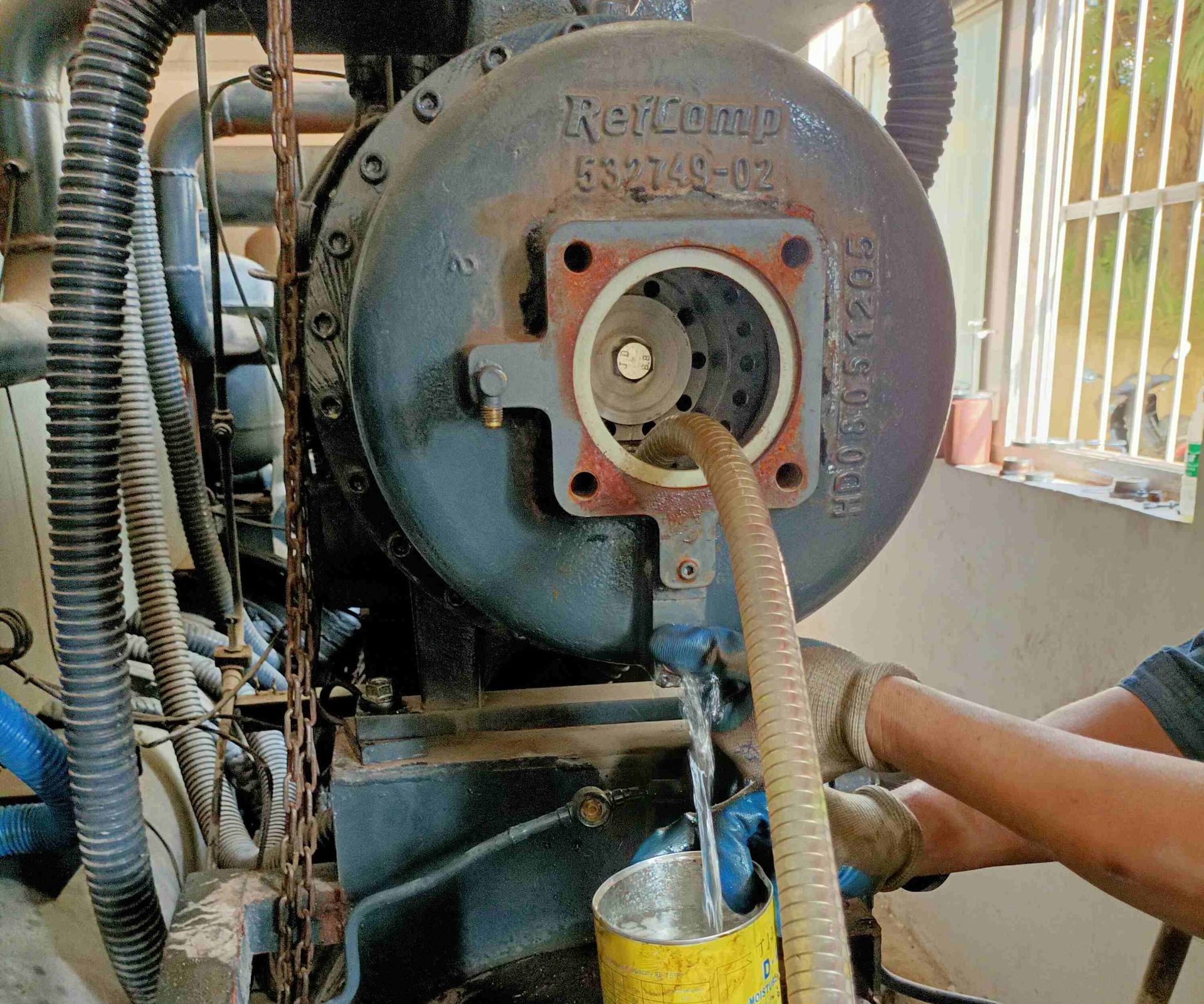 排除系统冷冻油,上图为压缩机低压端的机油。